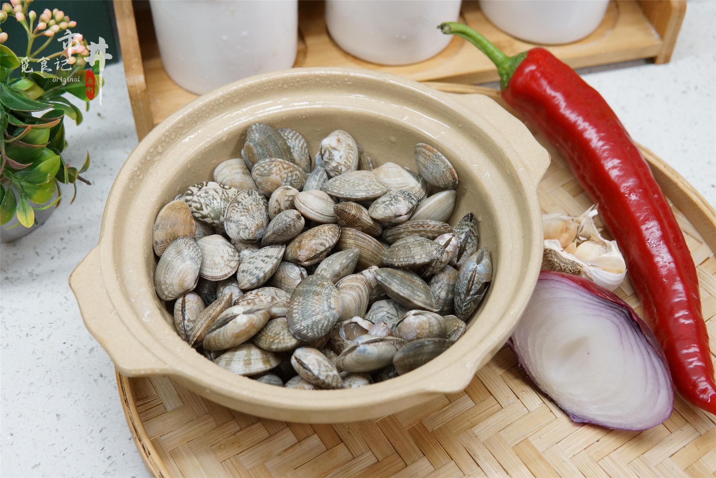 所需食材:海瓜子適量,洋蔥半個,大蒜1頭,紅椒1根,薑1塊,香蔥2根。