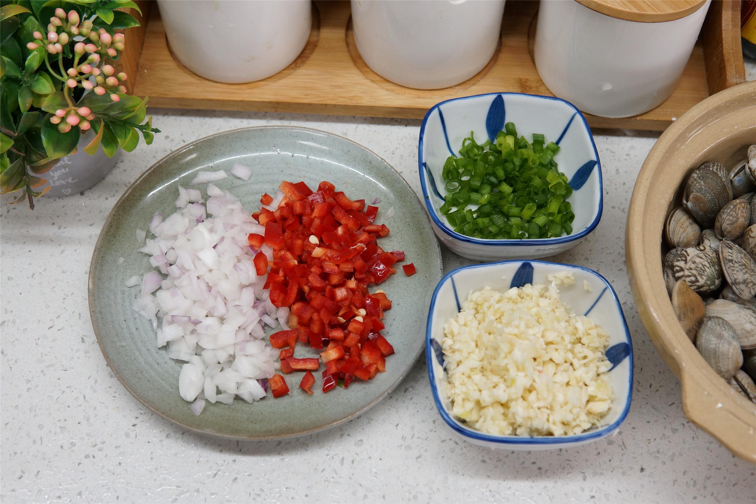 1、洋蔥剝皮後切成丁,紅椒洗凈切丁,大蒜和薑切末,香蔥切圈,海瓜子吐乾淨泥沙備用。