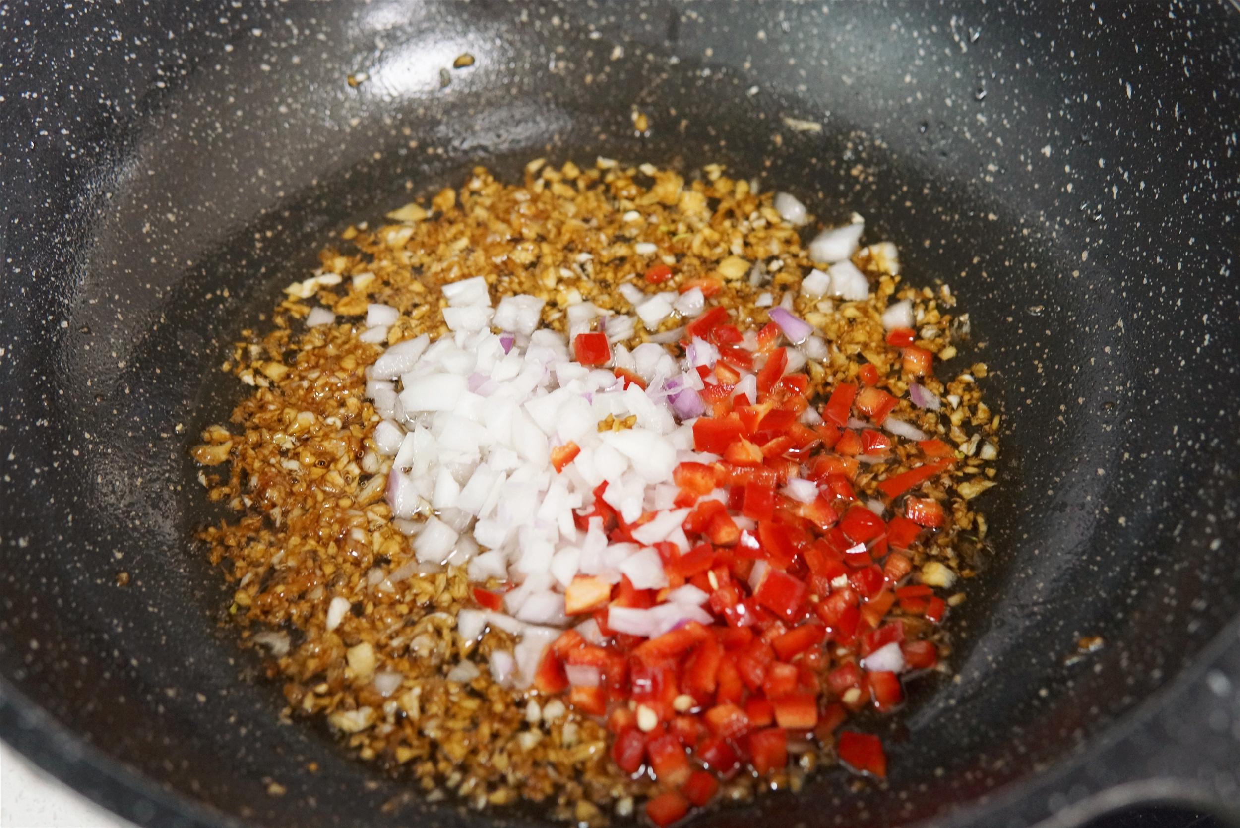 2、鍋中加入少許油,油熱加入切好的薑末、蒜末,炒香後加入1勺蠔油,1勺醬油,1勺白糖,適量的鹽和雞精,翻炒均勻後關火加入紅椒和洋蔥丁,翻炒幾下盛出備用。
