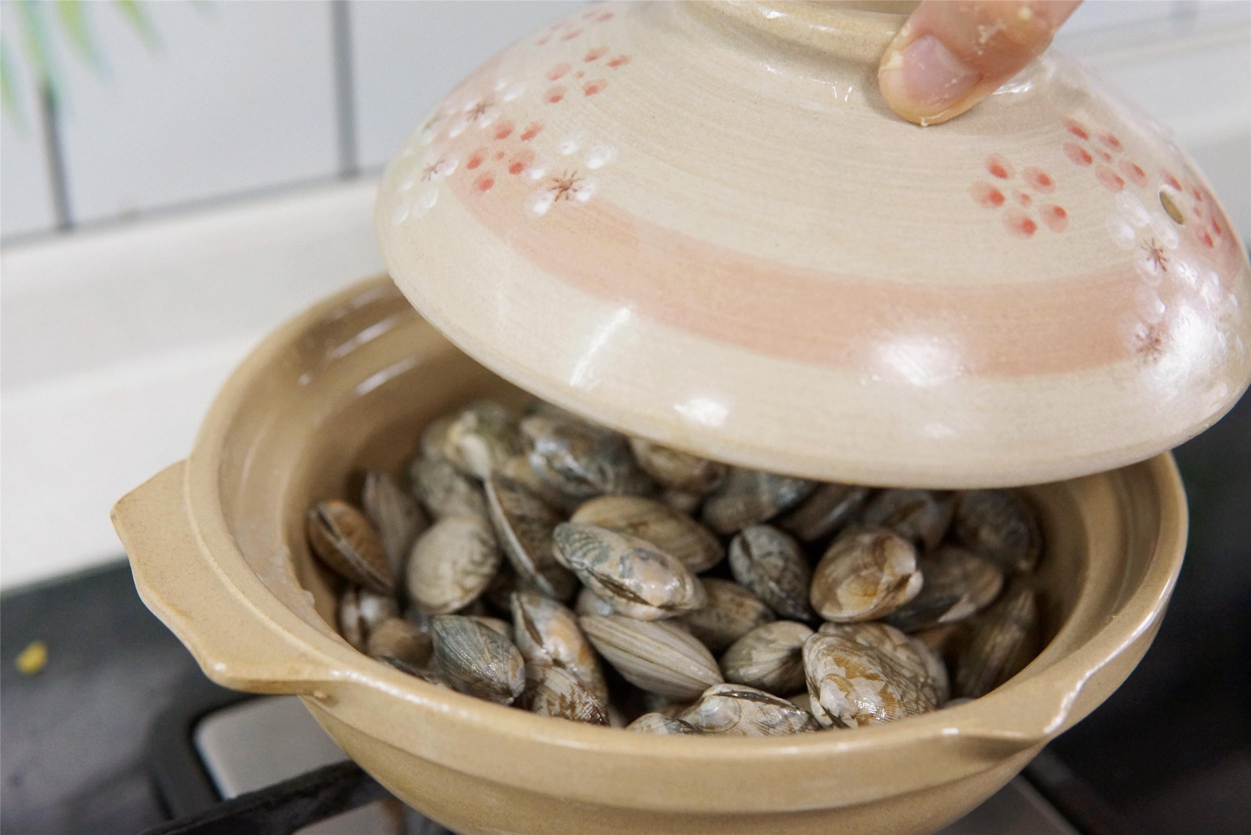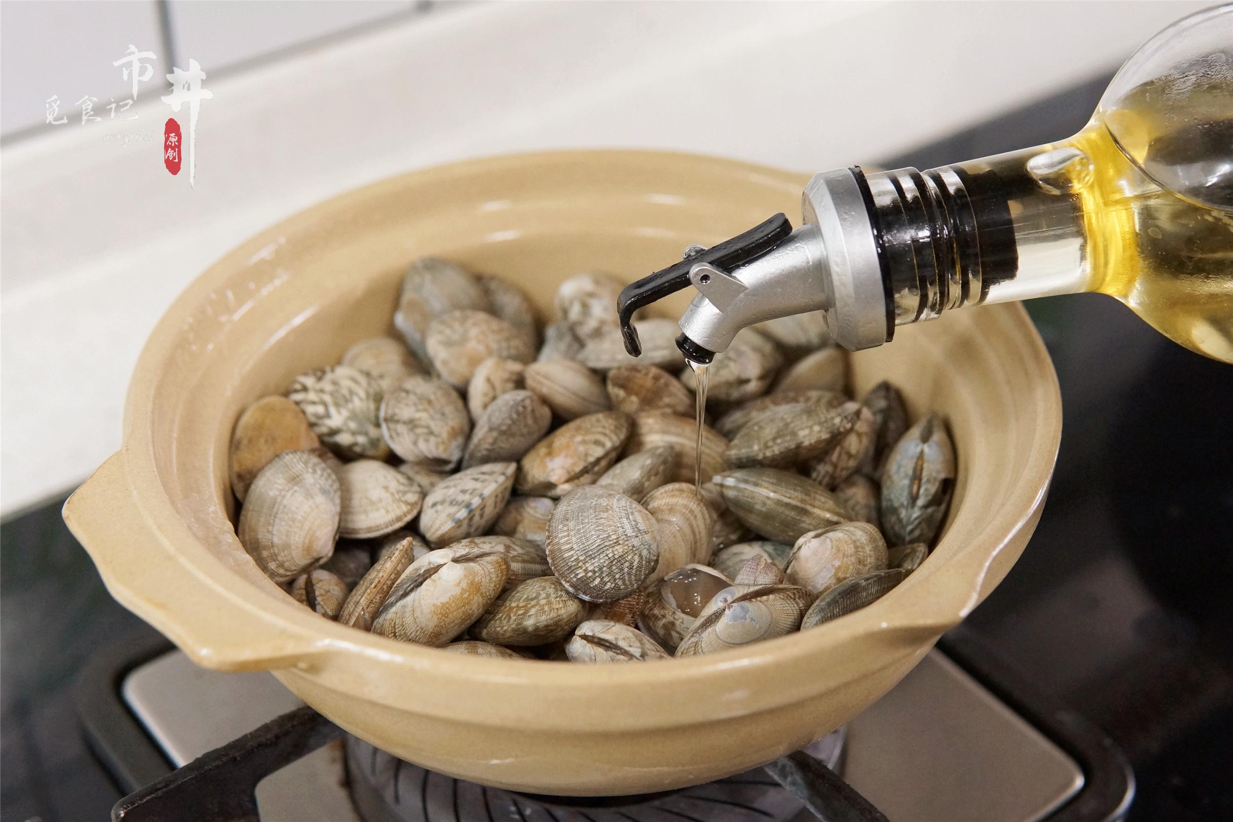 3、準備一個砂鍋,沒有砂鍋用炒鍋也可以,鍋中加入海瓜子,淋入適量的食用油,不需加水,蓋上蓋子大火焗2分鐘。