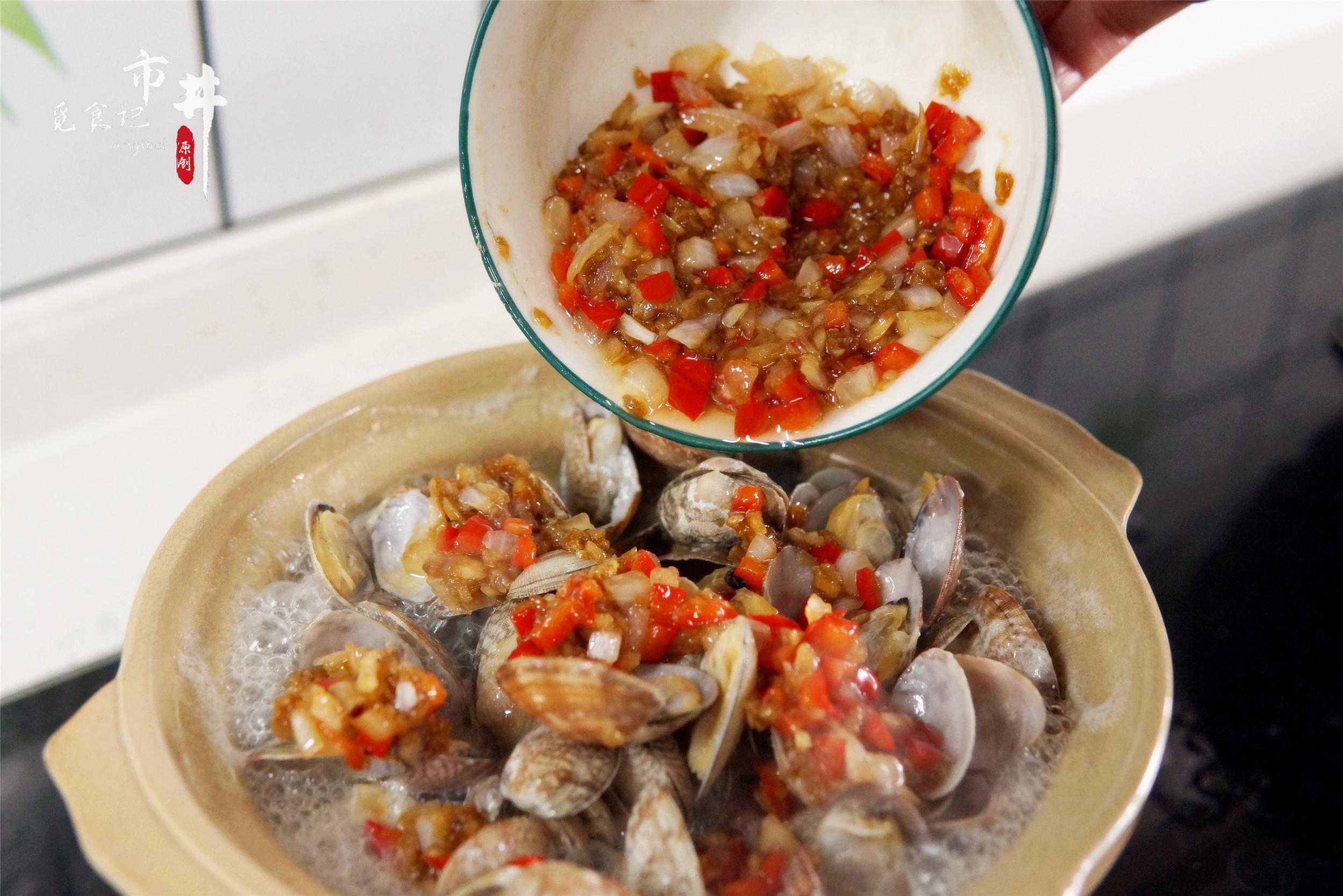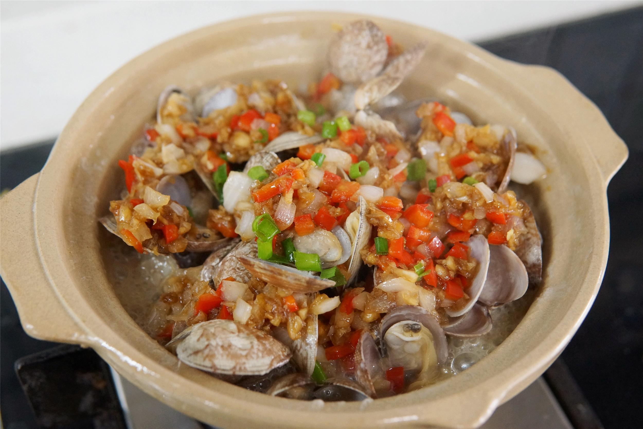 4、打開鍋蓋,這時海瓜子差不多張開了口,淋入剛剛炒好的料汁後,再次蓋上鍋蓋焗1分鐘,待時間到後關上火,打開鍋蓋撒上一點蔥花,一份鮮香解饞的生焗海瓜子就做好了。
