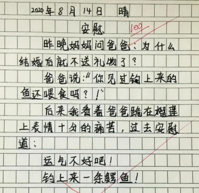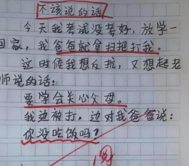 先看看這位小學生的作文,很明顯是兩位家長的談話內容。不得不說,小學生善於觀察的天性,還真的是在作文中體現得淋漓盡致。不過這位小學生表面上雖然是在安慰自己的爸爸,但實際上卻更像是在「傷口上撒鹽」。很多時候,家長的言行舉止對於小學生會有不可預估的引導作用,所以家庭氛圍和溝通方式對良好的教育很重要。