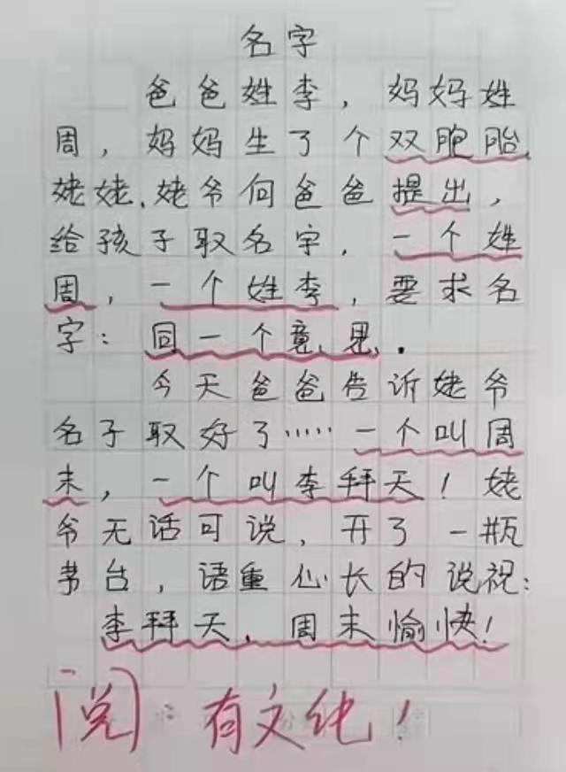 小學生的名字往往代表了家長的期望,但有不少家長在取名字的時候卻不用心,反而給學生帶來不小的影響。在這位小學生的作文中,讓我們發現原來名字還可以這樣取,就連國文老師都誇獎他。