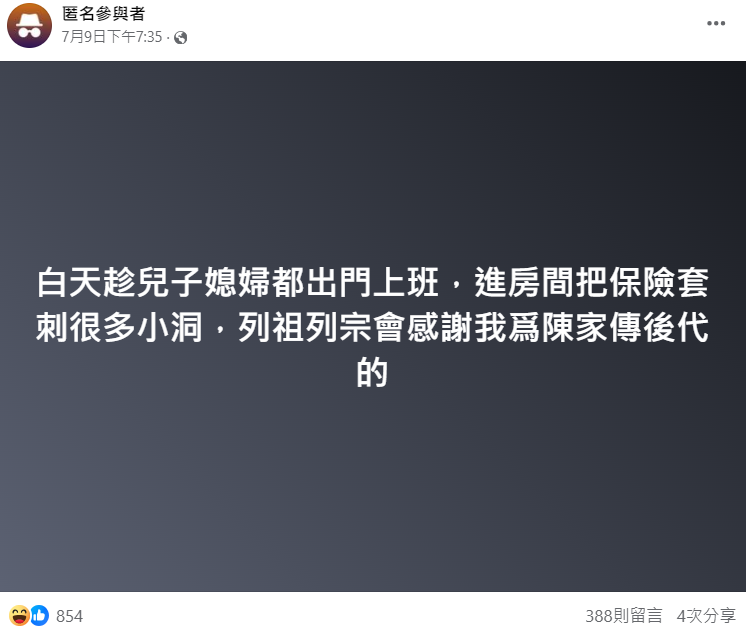 一名女網友在臉書社團「毒姑九賤婆媳討論區」上發文表示,自稱是婆婆,她心急想要抱孫,居然趁著白天兒子媳婦都出門上班,偷偷溜進房間,把保險套刺很多小洞,並自豪的說道「列祖列宗會感謝我爲X家傳後代的」。