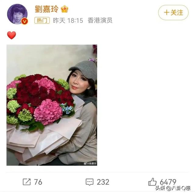 照片中的劉嘉玲抱著一大束花,雖說花好看,但人更好看,無疑是「人比花嬌」。