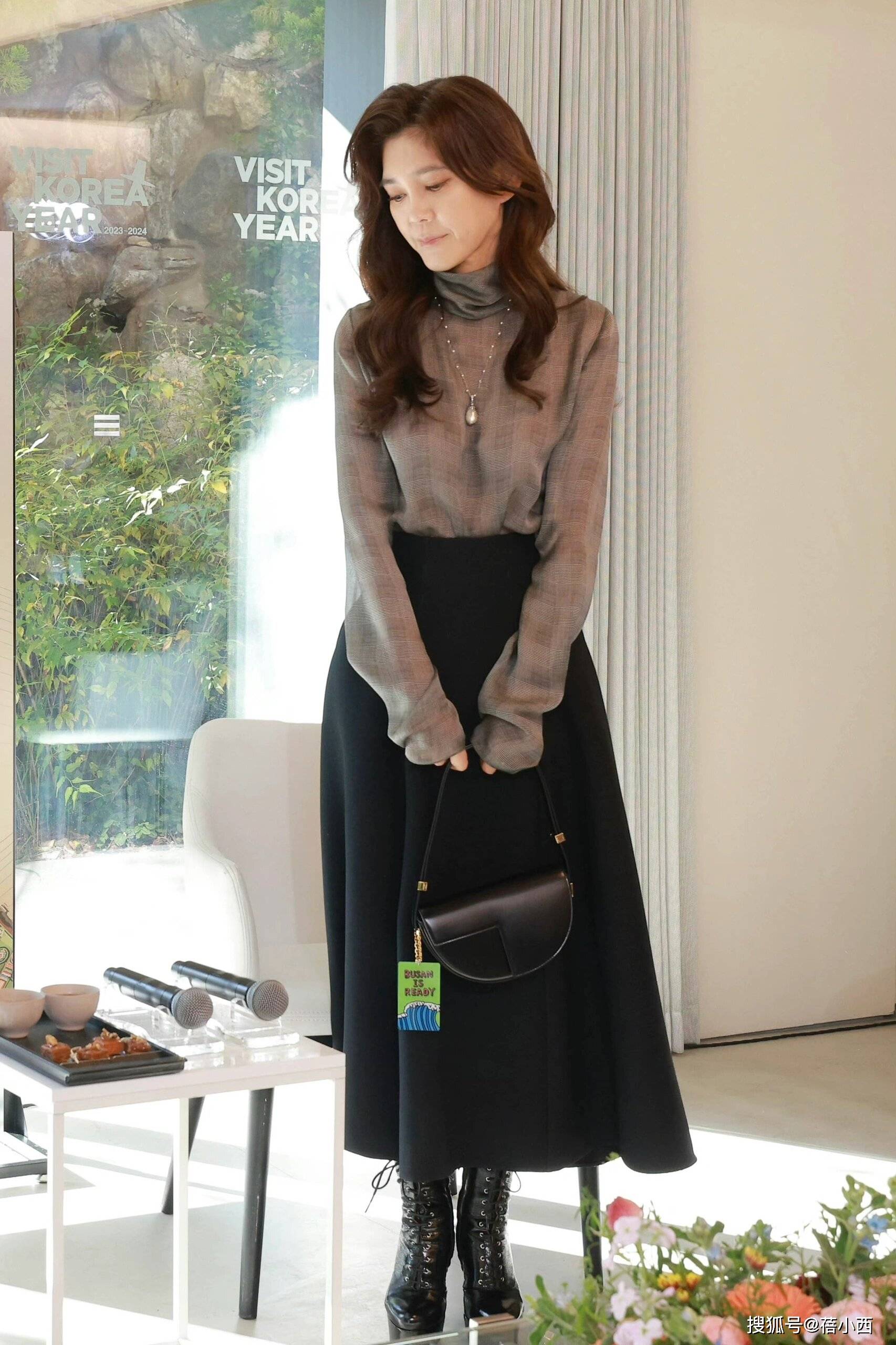偶爾,重要場合裡,她會搭配一雙黑色長手套。此物非凡,既顯復古雅韻,又增添幾分神秘感。那是一種對往昔風格的致敬,也體現她敏銳的時尚嗅覺。她的上衣,常選用高級灰色歐根紗,輕盈透氣,似有若無的華麗感,與黑色半裙相互映襯,構築出優雅而現代的時尚語彙。高級灰,不僅僅是一種顏色,更是一種內涵與氣質的象徵,恰似她個人風格的寫照。
