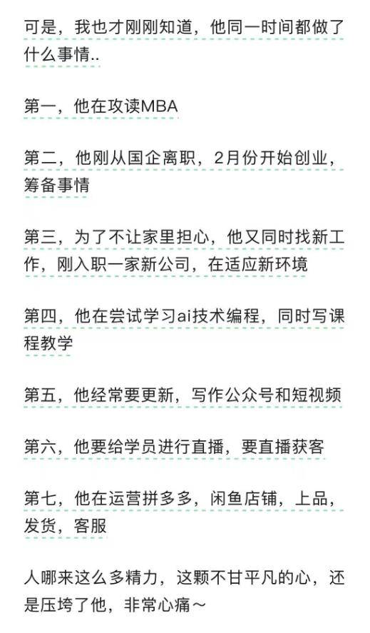 前段時間,劉志遠還將課程重點放到了時下盛行的AI賽道,其社群平台也幾乎保持的每日一更的頻率,也有其他友人透露,劉志遠工作太拼,平日經常加班熬夜。
