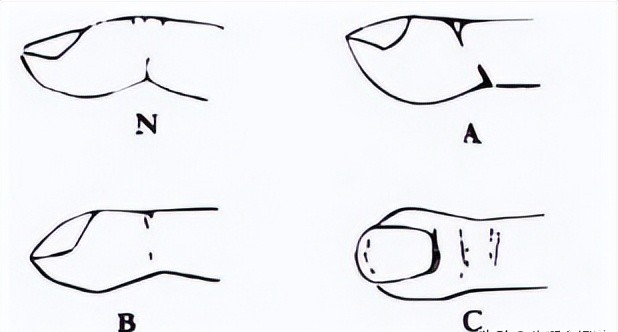 杵狀指一般都會在雙手、雙腳同時出現,患者肢體末端骨頭和指甲之間的軟組織角度、會達到 3 - 4mm。可能有人會好奇,能不能自己判斷呢?當然可以!正常手指的就像圖 N ,比例協調、線條流暢。再看圖 A,手指末端腫脹得特別均勻,這就是表蒙杵狀指;圖 B就有點不同,手指末節只有近端部位腫脹,看起來就像鸚鵡嘴巴,所以叫鸚鵡嘴狀杵狀指;還有圖 C,只有指節中間一部分軟組織腫大,這就是鼓槌形杵狀指。