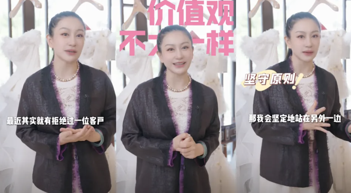 蘭玉是中國婚紗界的重量級人物,有「婚紗女王」之稱,曾為謝娜、李小璐、鍾麗緹、Angelababy等眾多知名藝人打造夢幻婚紗。她在影片中透露,這位客人的前妻是她很欣賞的人物,讓她在專業與良心之間做出了選擇:「他5月初結婚,(婚禮)本身流量也很大了,拒絕他有一個很特別的原因,價值觀不一樣」。而蘭玉也霸氣表示:「身為設計師是我的職業,但在這之前,我更要做好一個人。」獲得不少網友讚賞。
