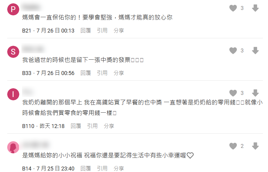 貼文曝光後在社群平台引發廣大迴響,許多網友紛紛留言替她打氣,更認為這是母親的祝福,在天上持續守護著女兒,「我家貓貓過世火化當天也是!我去繞一繞再回家,路上買了彩券,這輩子第一次中1000塊,到現在還捨不得花掉…」、「我的第一隻倉鼠過世時買的骨灰罐的發票也中了200元,兌換的錢至今都還放在我的皮夾裡」、「媽媽會一直保佑你的!要學會堅強,媽媽才能真的放心你」。