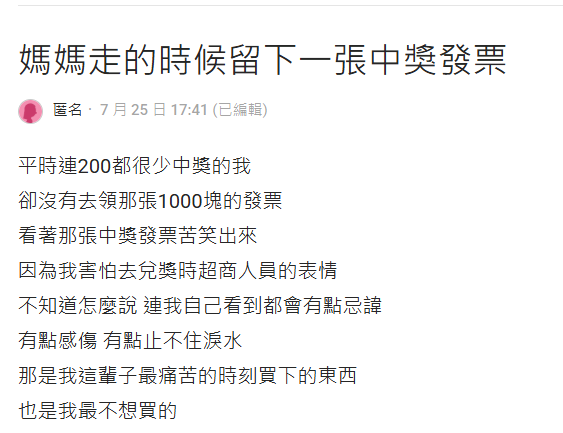 中千元發票遲遲不兌獎!她曬出「媽媽留下最後發票」 一看明細「眾人秒懂全哭」