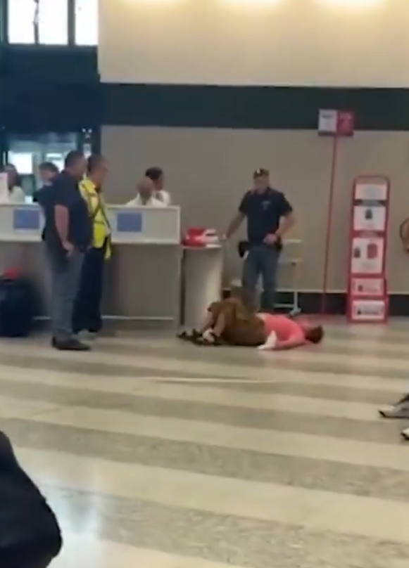 面對地勤人員的要求,這名女子突然情緒失控,直接倒臥在機場大廳的地板上,並且開始像個幼童般大聲哭鬧,不斷用手腳敲打地面,還來回躺地翻滾,完全無視周遭旅客的目光。現場工作人員雖然試圖安撫她的情緒,但她仍持續無理取鬧。