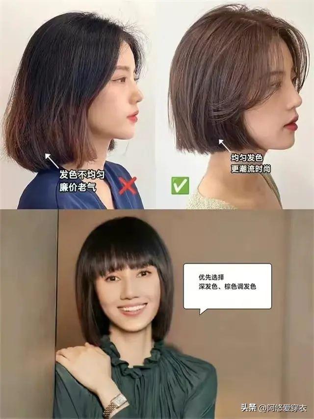 染髮的時候記得,髮色一定要均勻,深色髮色比亮色的髮色更適合年紀大的女性,髮色不均勻,或者嘗試挑染以及其他比較艷麗的髮色,都十分容易產生廉價感,導致個人氣質拉低。