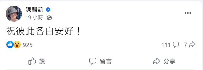 沒想到昨日陳麒凱突然在粉專寫下:「祝彼此各自安好。」短短一句話,立刻引起許多網友關心,「哥怎麼了?」、「什麼事了,還好嗎」。