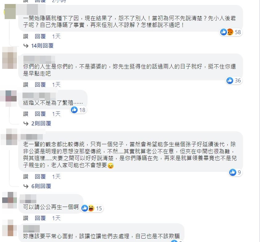 然而也有網友抱持相反意見,認為該名人妻明明有這樣的問題,卻不提前溝通,才會導致如今的狀況:「一開始隱瞞就種下了惡因,現在怨不了別人。」、「應該提早說明白不生,最後才講不太尊重長輩。」、「早該平常心面對,而不是欺瞞。」、「早知道婆婆有此觀念,你卻沒想好怎麼說,丈夫也沒處理好。」
