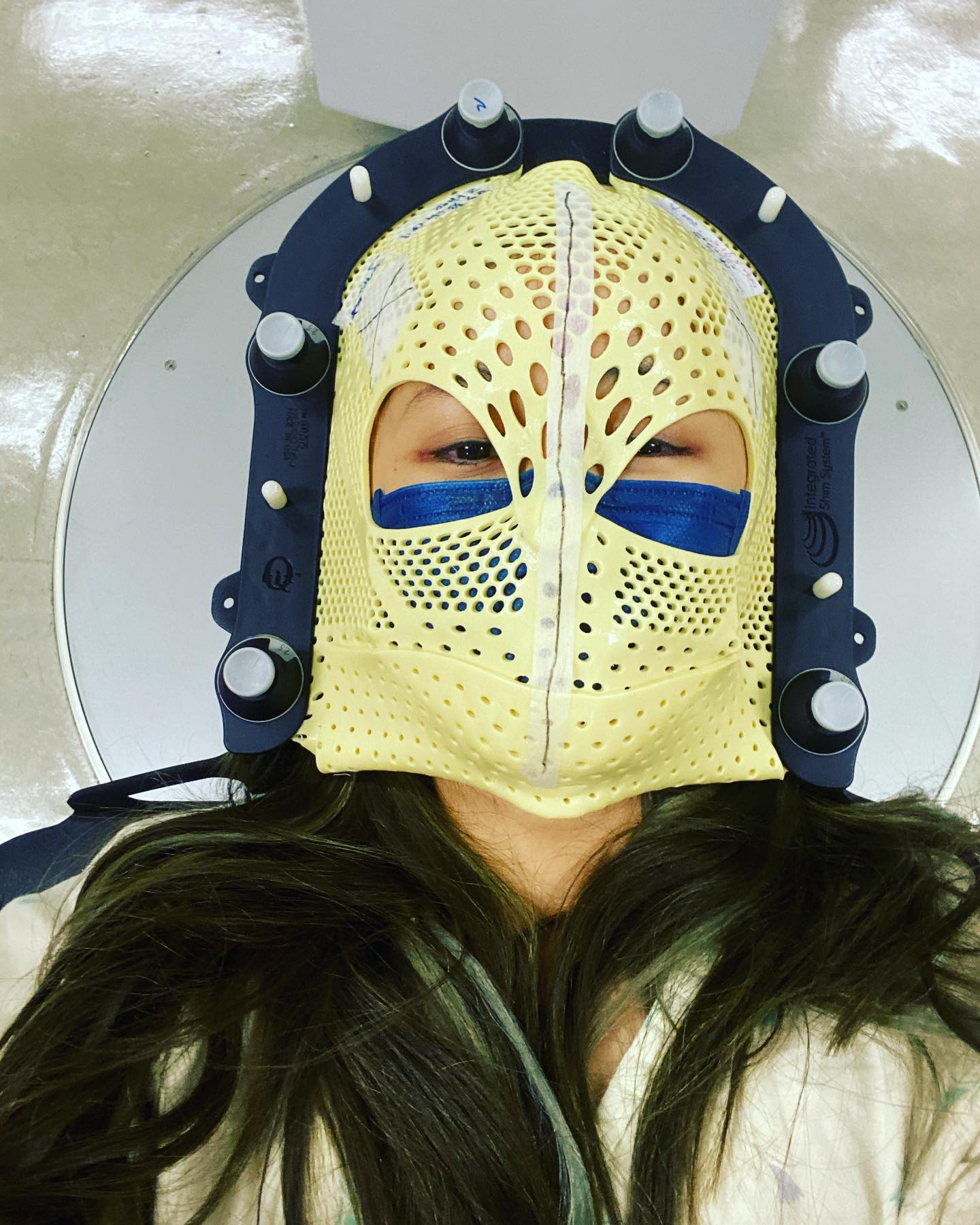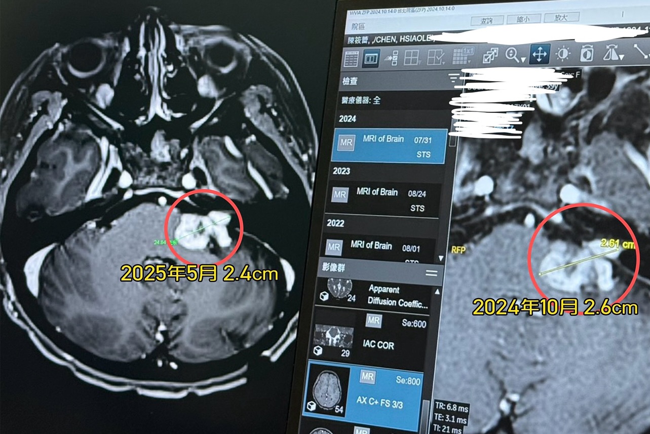 第一次手術歷時十多個小時,由於腦瘤周遭有許多神經,術後造成左臉顏面神經受損,當時手術後完全不能動,好不容易好轉,不料2021年病情一度復發,甚至出現手指變形、行為失控等症狀,被迫再次接受放射治療,因聽神經瘤讓她聽力受損有如70歲老人家,至今左耳仍聽不見。