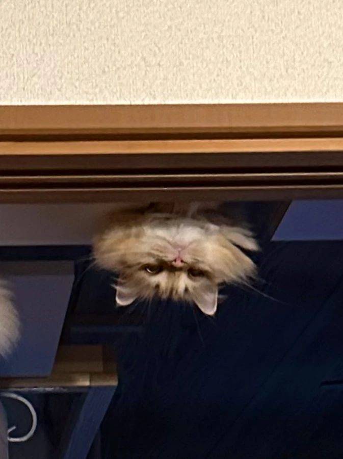 這位推特網友表示,他妻子前幾天在家裡準備進卧室,突然就尖叫了一聲,他趕忙跑過去一看,原來是家裡有隻貓的腦袋正從門框上面垂下來,正看著他們呢!這表情好像還在說: