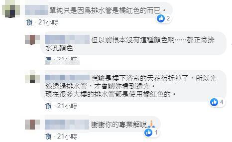 正當原PO還在困惑之時,終於有內行網友出面解答!有神人網友解釋,這是因為樓下浴室的天花板被拆掉了,光線透過排水管才會造成「冒紅光」現象,同時也補充說:「現在很多大樓的排水管都是使用橘紅色的。」