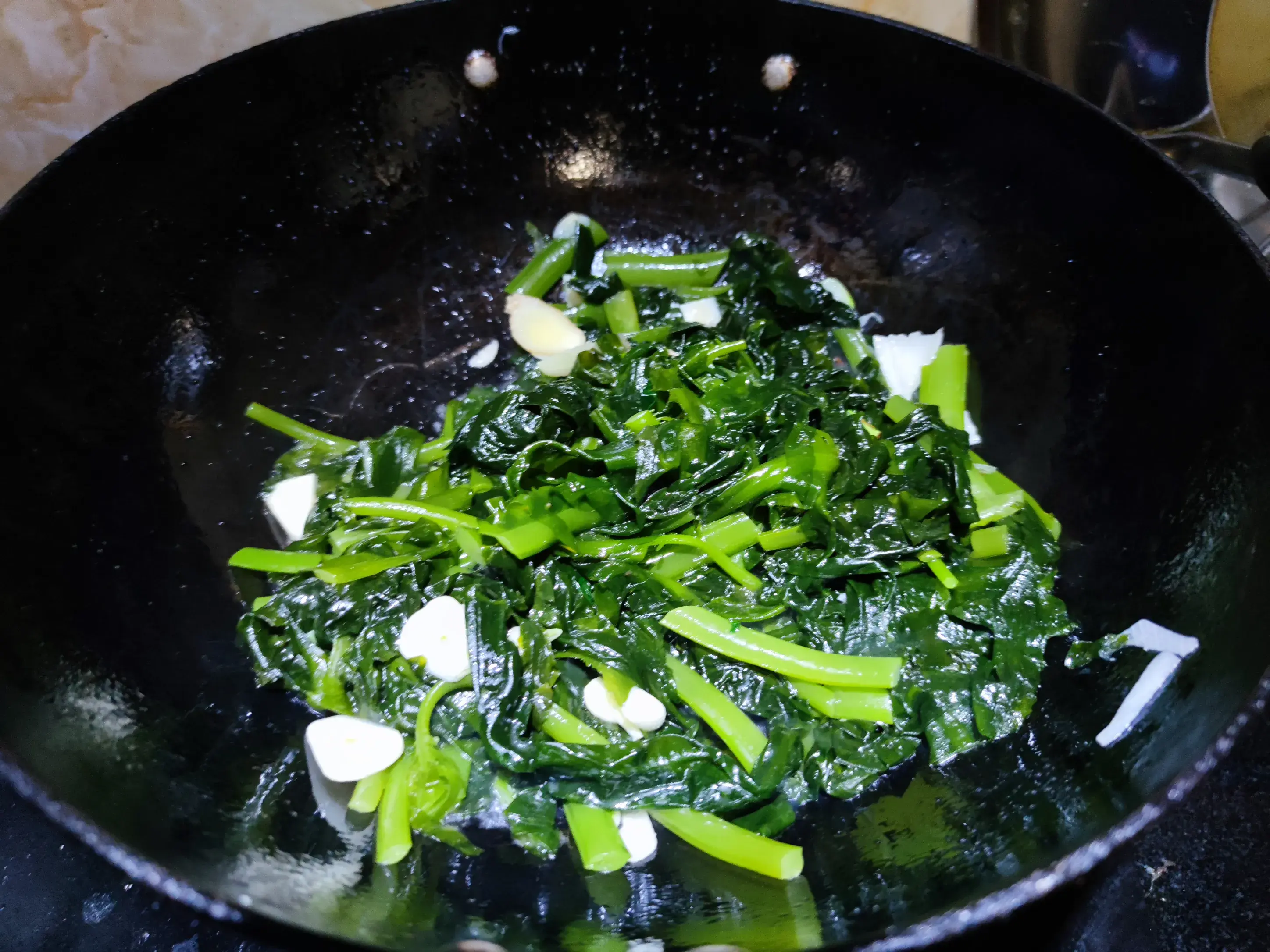 3.鍋中入油爆香蔥姜蒜,下入海帶芽翻炒均勻,烹入料酒和一品鮮醬油炒勻,然後添湯沒過海帶芽。