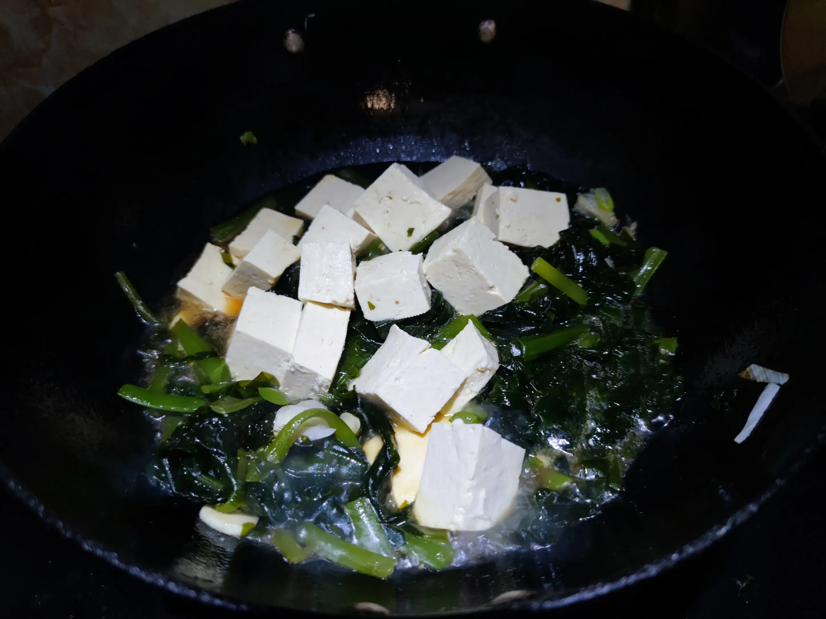 1.新鮮的海帶芽去除根部,然後一縷縷的清洗乾淨,滷水豆腐切成小塊備用。