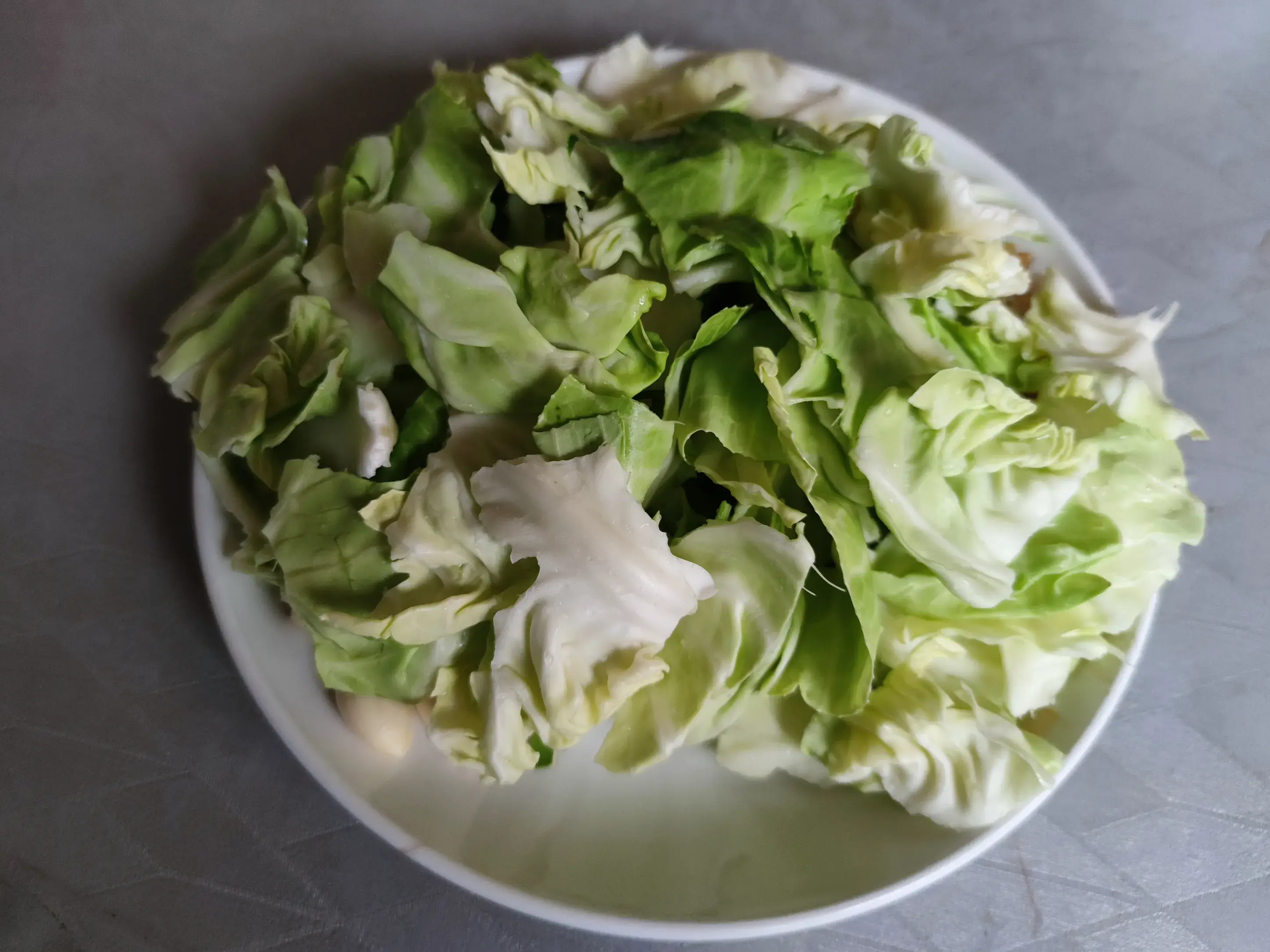 2.洗凈的高麗菜用手把菜葉一片片掰下來,然後把菜梗和菜葉分開撕成小塊備用。