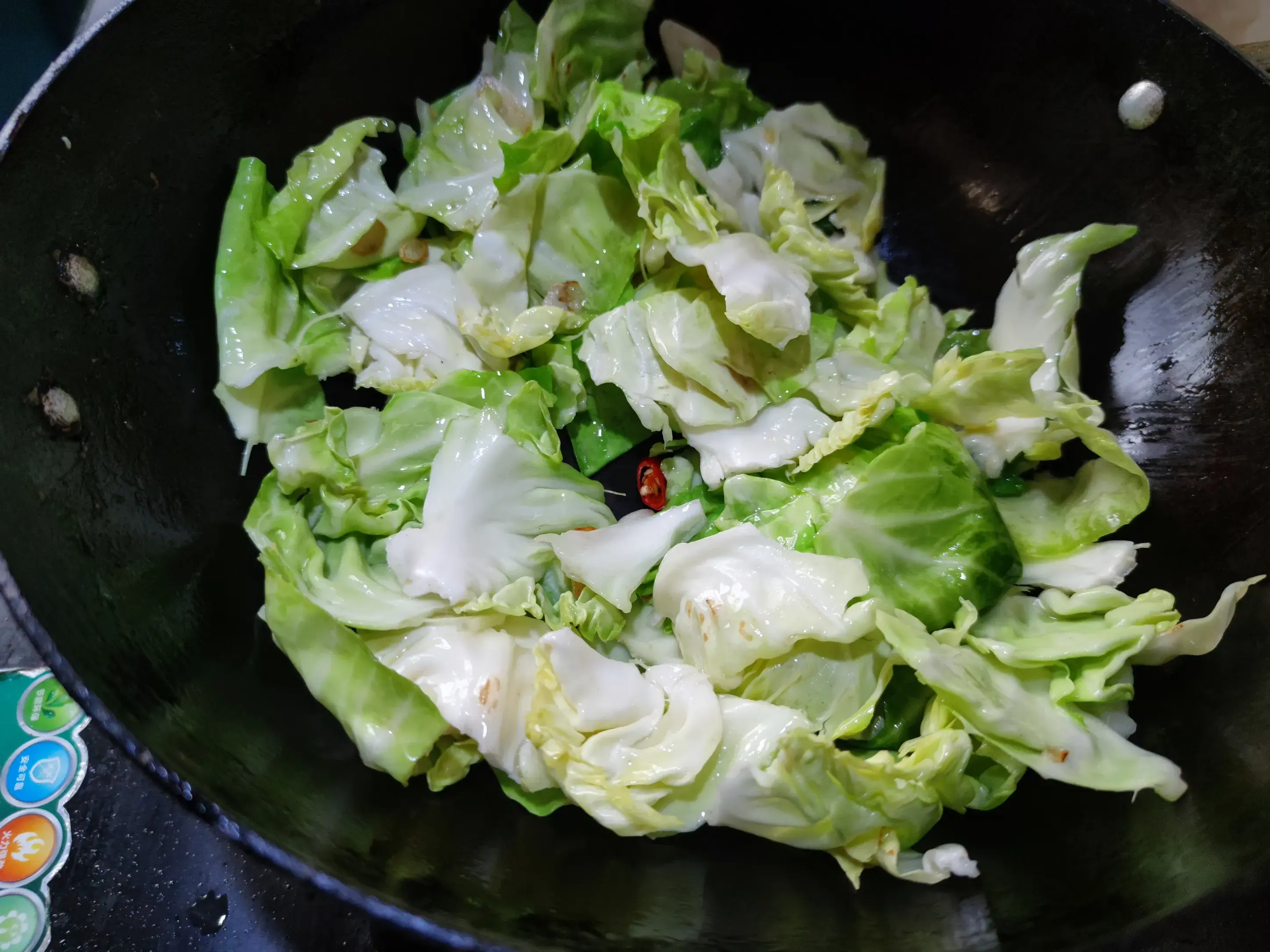 4.鍋中入油下入花椒粒用小火炸香,撈出花椒粒后入蔥姜蒜和干辣椒段爆出香味,下入高麗菜的菜梗部位煸炒均勻,菜梗炒軟後下入菜葉翻炒均勻。