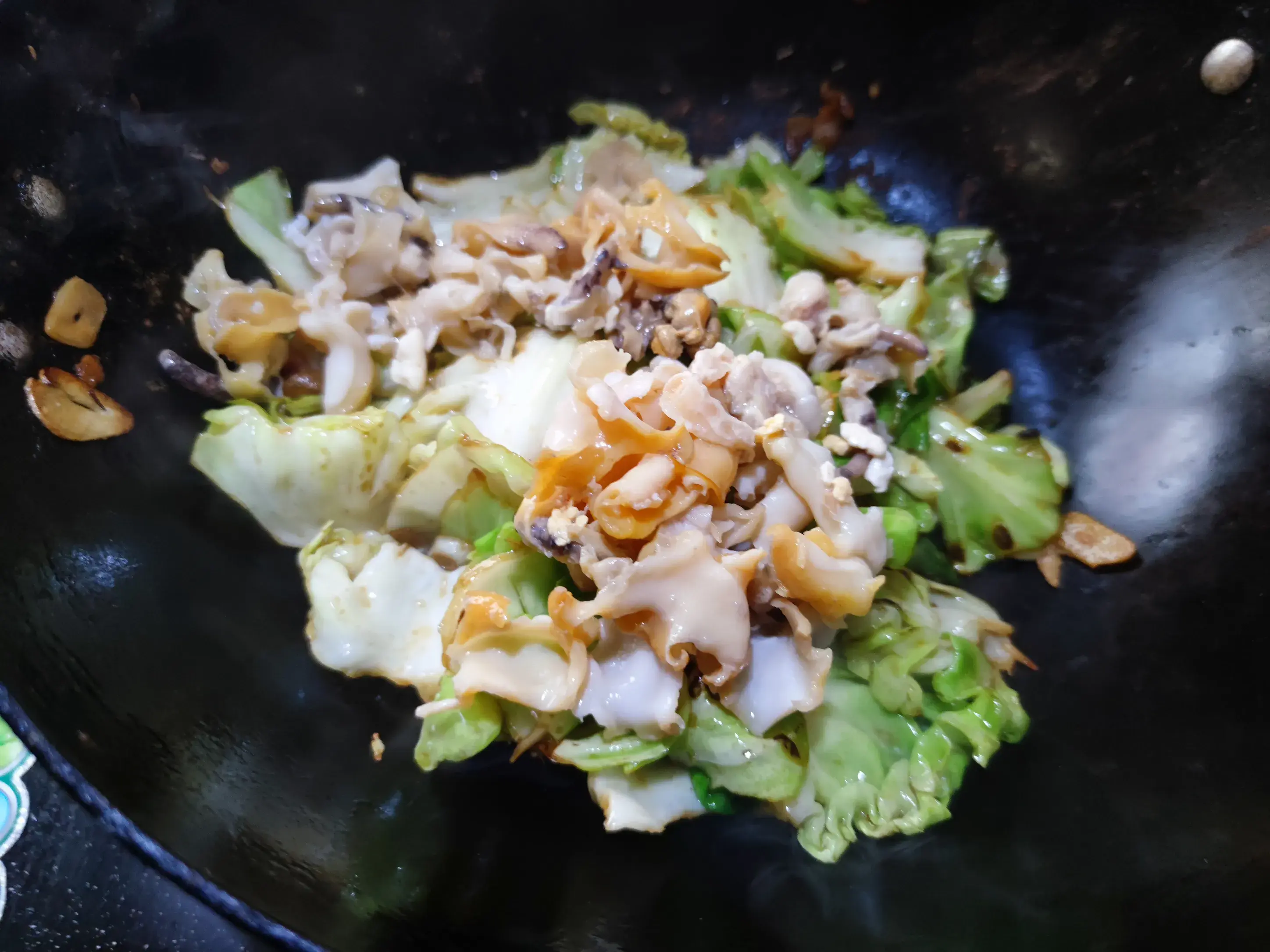 5.鍋中烹入料酒和一品鮮醬油,翻炒至高麗菜斷生后,下入過涼后海螺片,加入鹽、胡椒粉和蚝油調味,翻炒均勻后即可出鍋享用。