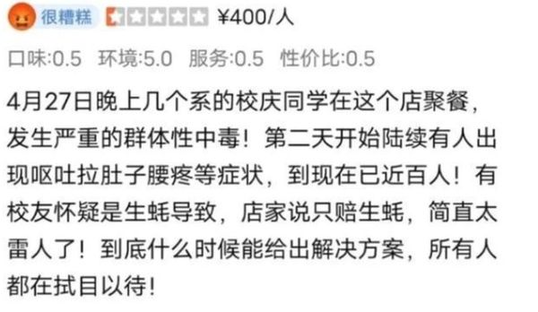 綜合陸媒報導,某隻社群帳號公開一份《致全體校友及在校師生建議書》,指出上月26至28日間,有上百名校友於校東南門外的一間精緻粵菜館用餐,會後卻出現嘔吐、腹瀉、發熱、腹部不適、乏力、肌肉酸痛等症狀,疑似是食物中毒,部分受害者也已是60歲以上老人,紛紛入院接受治療,部分人已安排住院。