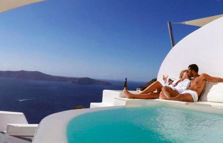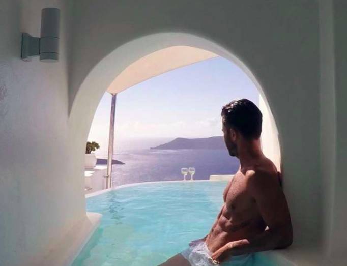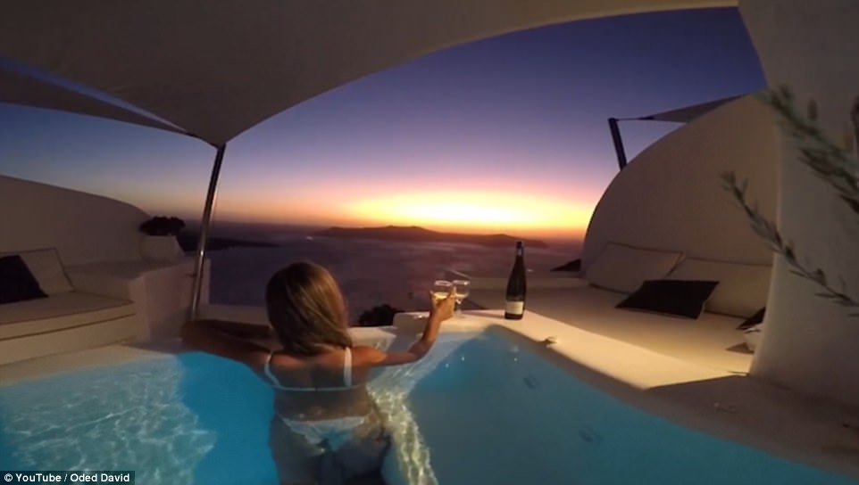 這時大衛才知道游泳池的盡頭竟能夠通往戶外陽台,而妻子早就在那裡邊喝酒邊欣賞美景啦!據說聖托里尼島擁有全世界最美的夕陽,能夠在這樣的飯店欣賞夕陽,人生大概沒有遺憾了吧QQ