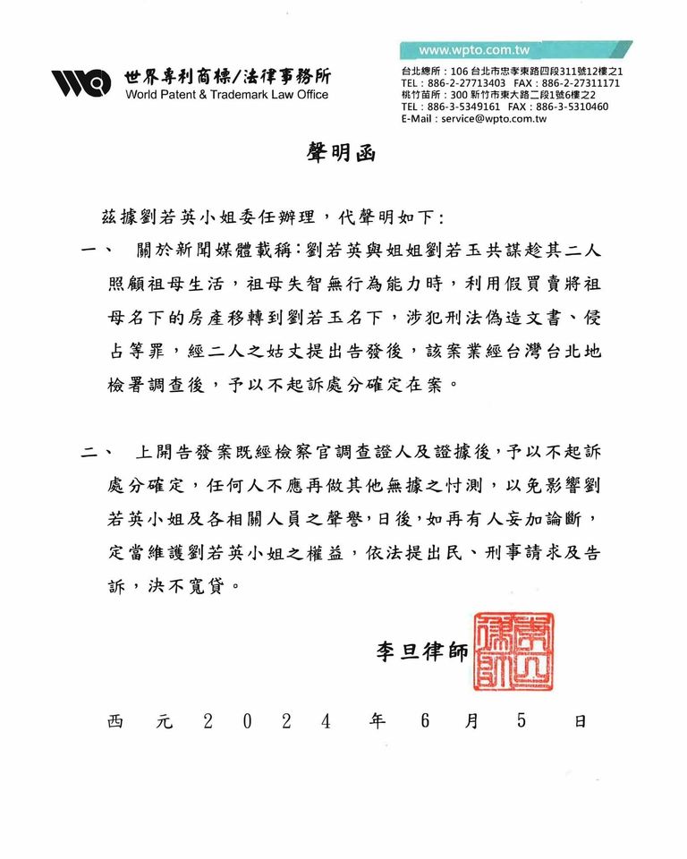 對此,劉若英所屬的「相信音樂」,也於稍早發布律師聲明,表示該案早以不起訴處份,但如今卻有讓旗下藝人陷入爭議中,特此聲明,「日後,若再有人妄加論斷,定當維護劉若英小姐之權益,依法提出民、刑事請求及告訴,決不寬貸」,同時也表達劉若英對此事的感想,「通過媒體報導得知海外親友相關表述,真的傷心也傷人」。