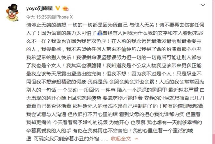 這樣的婚姻對劉雨欣的打擊有多大,那是可想而知的,離婚後的她,患上了憂鬱。甚至有一次,她給家人留了錢,安排了一些事,然後選擇了結束生命,還在發現及時給搶救了回來。