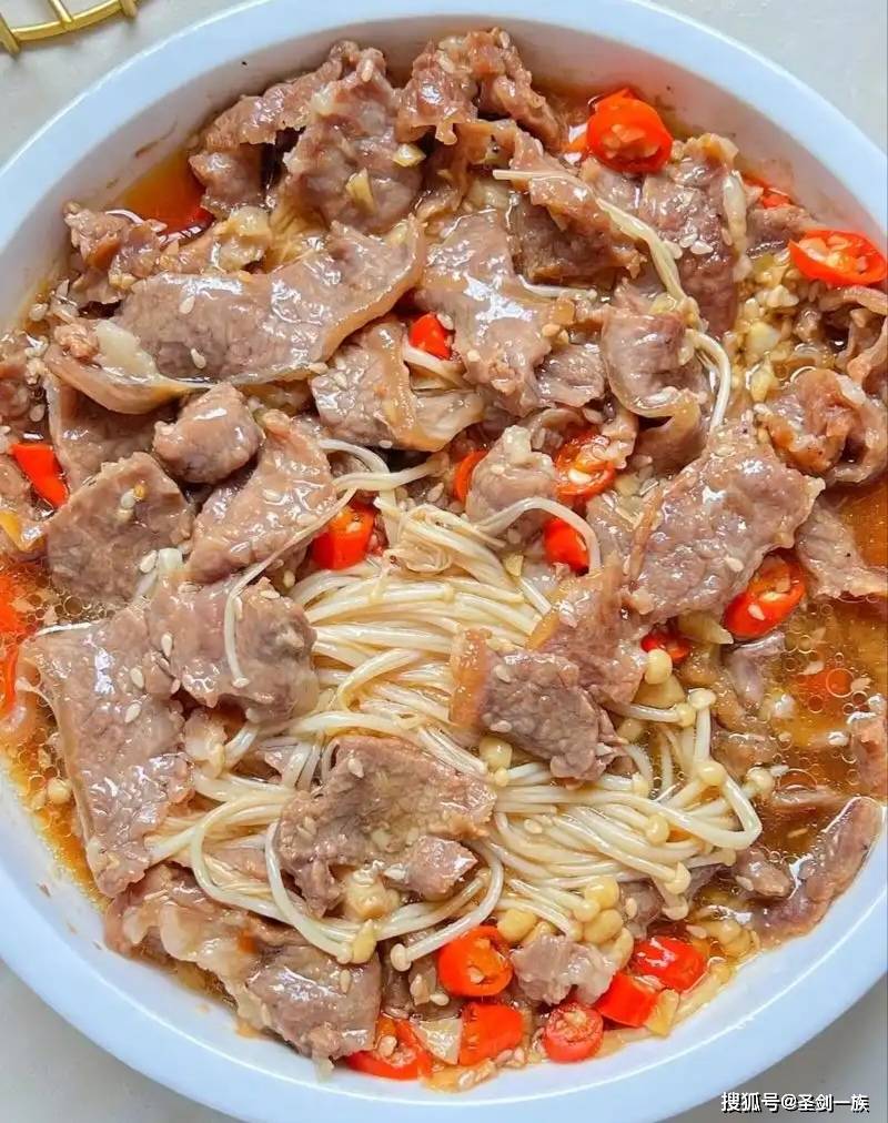 3. 碗底鋪上金針菇,鋪上牛肉,淋上料汁,水開蒸5分鐘,撒上蔥花即可