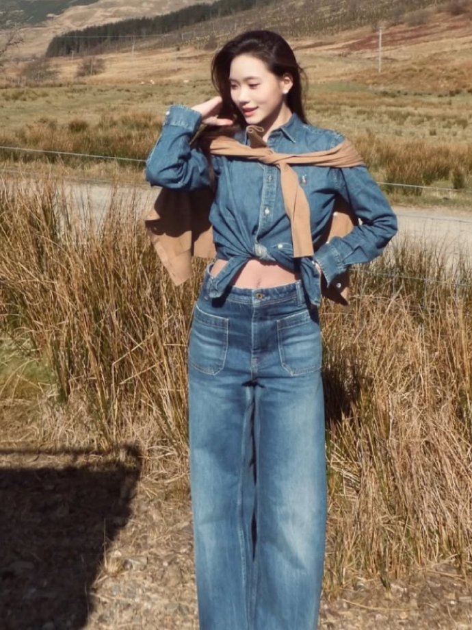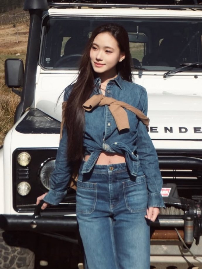 仔細看她將牛仔衣給扭起來,露出肚臍眼和小蠻腰,將風衣披在肩頭很有個性。