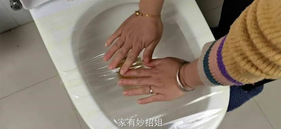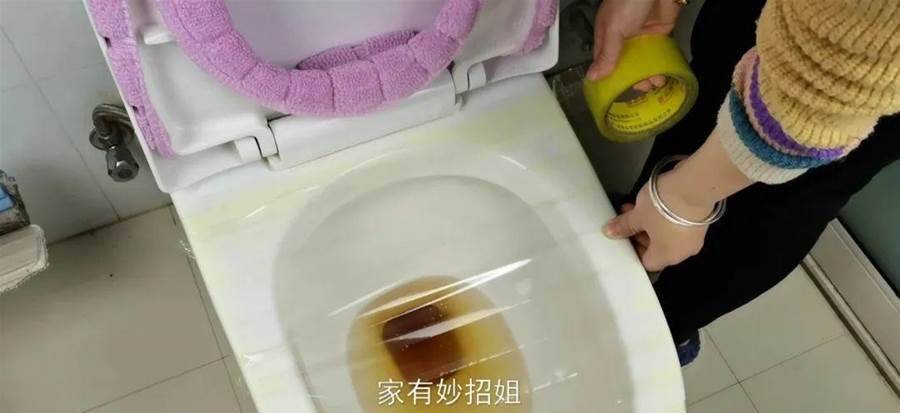 然后我們再將透明膠帶撕開,沿著馬桶的邊緣從這一邊黏到另外一邊。就這樣一直黏,將整個馬桶都用膠帶黏好。但是我們黏的時候也要注意,第一根膠帶要和第二根膠帶重疊一部分。全部黏好,馬桶就形成了一個密閉的空間。