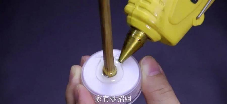洞戳好后,我們再將剛剛接好的筷子插在瓶蓋的洞裡,然后筷子和瓶蓋的周圍,打上一圈熱熔膠固定。
