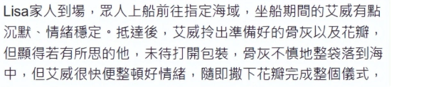 2025 年初,Lisa 病情急劇惡化,離開了這個世界。艾威以海葬的方式送別摯愛,海葬的原因源於他們游泳時的相識,這份獨特的緣分讓艾威選擇與 Lisa 再次於大海相聚。儀式中骨灰不慎整袋落海,這意外恰似病痛和 Lisa 的離去帶給艾威的措手不及。