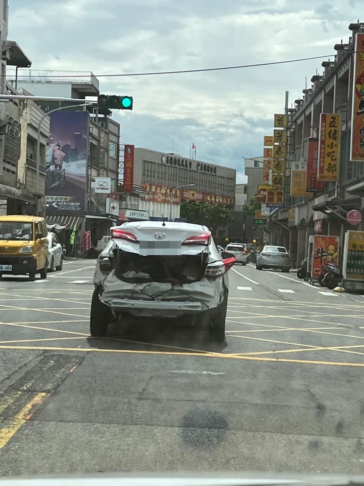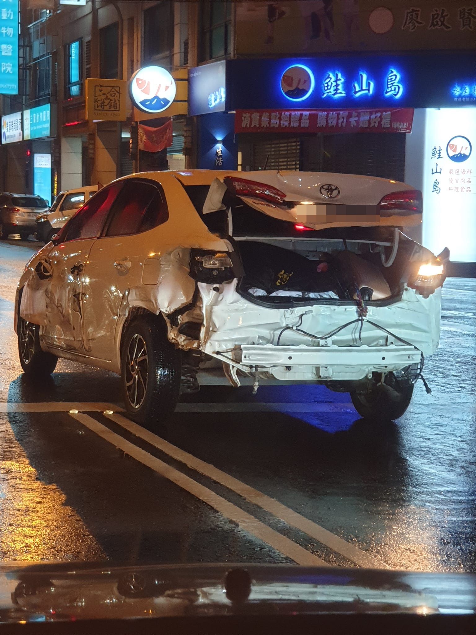 從曝光照片可以看到,正在等紅燈的白車大半車身都已經超過等待線,整輛車仿佛經歷過嚴重車禍,不僅車尾撞爛、後車廂也已經關不上,在昏暗的視線中只能看到一顆苟延殘喘的車尾燈,也難怪會引起用路人注意,同時提醒大家要小心,照片曝光後瞬間掀起熱議。
