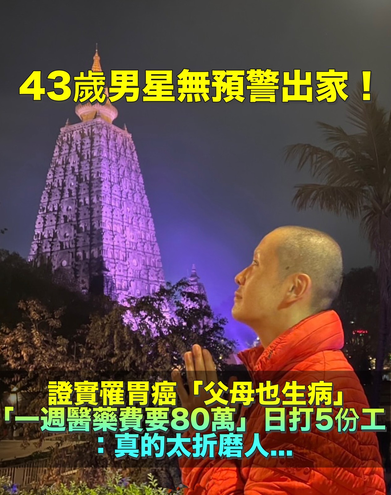 43歲男星剃髮出家!證實罹胃癌「雙親也生病」 獨扛家計「一週醫藥費要80萬」打5份工:太折磨人