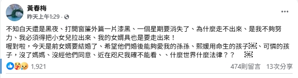 在深夜發布的文章中,S媽寫道:「前女婿要結婚了,希望他們婚後能夠愛我的孫孫、熙媛用命生的孩子。」她感傷地說:「近在咫尺我卻不能看,什麼世界什麼法律?」這番話引來眾多網友的關心與支持。有人安慰她說:「珍惜您擁有的,放下您失去的」、「加油徐媽,為了孩子堅強」、「對逝者最好的紀念,就是活出精彩人生」、「相信熙媛在天上一定會保佑她的寶貝」、「您要過得好,大家才會過得更好」。