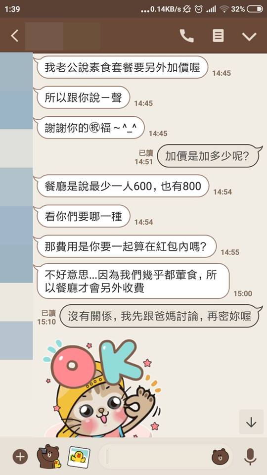 根據《東森新聞》報導,一名網友日前在臉書「爆廢公社」中po出與準新娘好友的對話截圖,並自嘲寫道:「最近才知道原來參加喜宴,吃素食桌是需要加價費用的」。而從圖片中可以看到,原po的好友先是用LINE提醒他「素食套餐要另外加價喔」,接著原po則詢問要加多少錢,沒想到好友竟然回覆他有兩種價格,分別是600和800,看原po想吃哪一種。