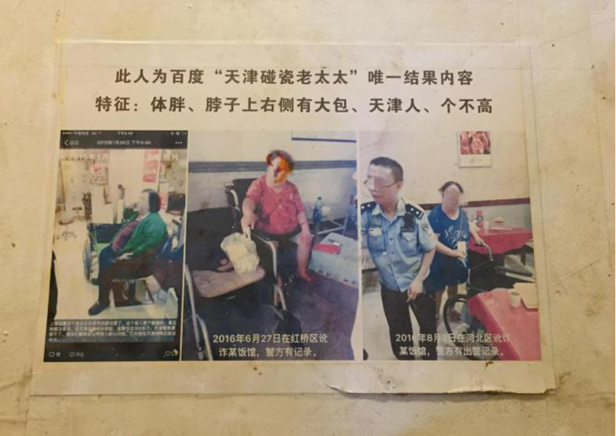 後來這家餐館就在牆上新貼上了一張A4紙。上面的內容不是菜單也不是店舖的介紹,而是簡單印了兩行字和三張照片,老闆把所有員工都聚集在一起,指著這張A4紙對大家說:「大家把這個都背下,如果這個人來了,一定不要接待。」員工抬頭一看,只見A4紙上寫著:「天津碰瓷老太太,特徵:體胖,脖子上右側有大包,天津人,個不高,推輪椅。」下面還配上了三張老太太的照片。