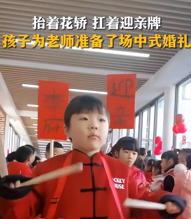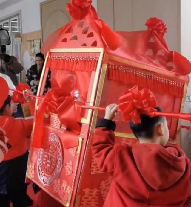 這一天,孩子們穿著紅色的衣服,有的舉著迎親牌,有的「抬轎子」,共同見證了新娘在所帶班級完成出閣禮的場景。鳳冠霞帔的新娘在孩子們的簇擁下,等待著新郎的到來。
