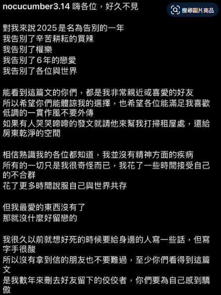 根據《ETtoday星光雲》報導,知名單口喜劇演員天殘選擇在今年4月生日當天告別人世。而賀瓏在沉默2個月後,今日承認天殘確實為前女友,兩人交往6年後分手,並公開了她生前留給摯友們的最後一封信,內容提到2025年是屬於告別的一年,她先後告別了事業、朋友權樂,以及一段長達六年的感情。