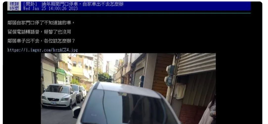 據《三立新聞》報導,原PO鄰居家的車庫門口,停了一台陌生車輛,堵在那邊害車子完全卡住、出不去「留個電話轉語音,報警了也沒用,鄰居車子出不去,各位該怎麼辦?」從原PO分享的照片可見,車庫外面疑似放了交通錐,告知民眾是車庫出入口,但對方車主顯然選擇無視,加上車庫外面沒畫紅黃線,責任歸咎變得更曖昧不清。
