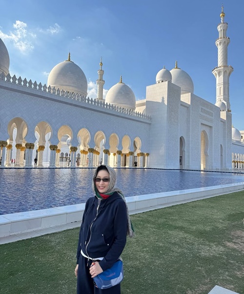 大咖女星攜父「拜訪清真寺」門前合影 「化身中東美人」頭巾藏亮點
