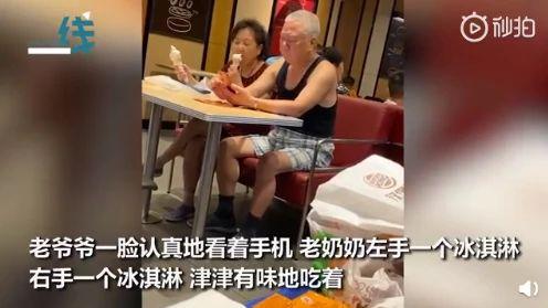 老爺爺一臉認真地看著手機,老奶奶左手一個冰淇淋,右手一個冰淇淋,津津有味地吃著。