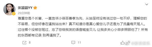 由於張蘭的一席話又再次於網路上引起一陣喧然大波,因此覺得自己莫名被攻擊的張穎穎,也終於不忍了決定在今天(16日)出面發聲了,她在微博上直接隔空嗆張蘭,「尊重您是個長輩,一直告訴小菲百善孝為先,從始至終沒有說過您一句不好,理解您的不容易,但您好像在逼我站出來?真不知道你是真心愛您兒子還是為了流量每天罵人,過往哪個沒被您罵過。」