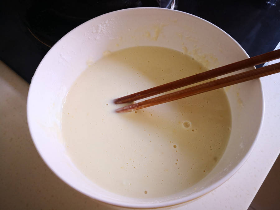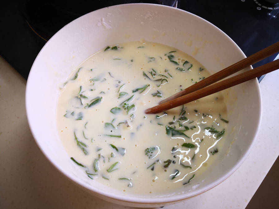 採摘回來的花椒芽要挑選一下,去掉有刺的部分,放到淡鹽水中浸泡30分鐘,然後沖洗乾淨備用;取200克麵粉和50克澱粉放入碗中,磕入一個雞蛋,攪拌均勻後開始分少量多次倒入清水,調成拉絲如酸奶狀的麵糊。