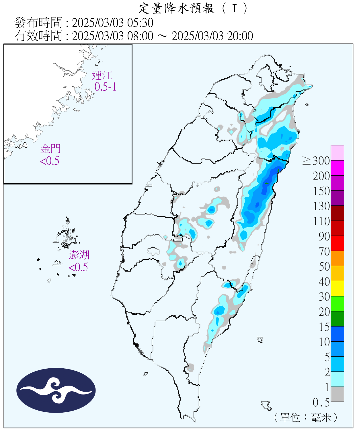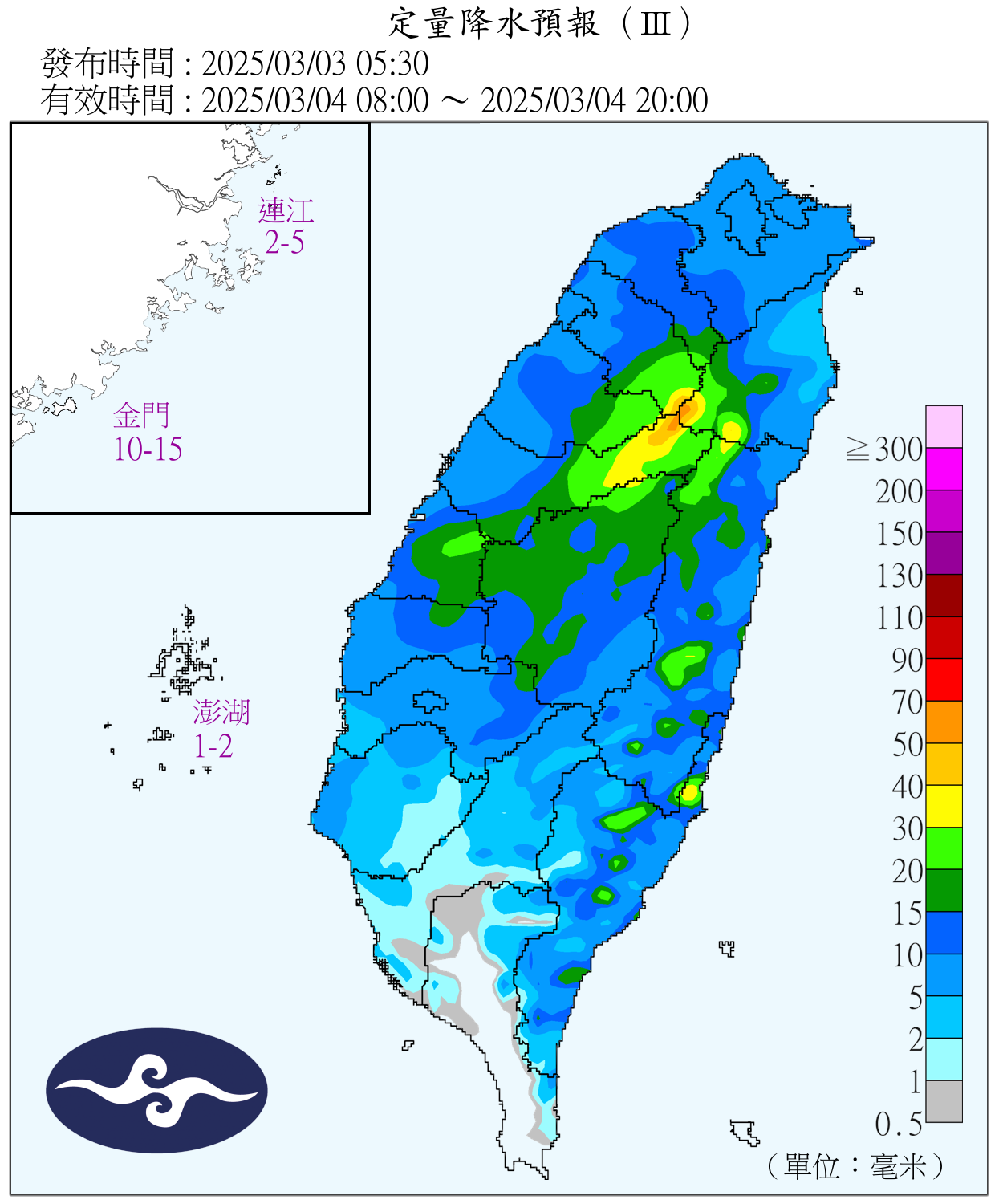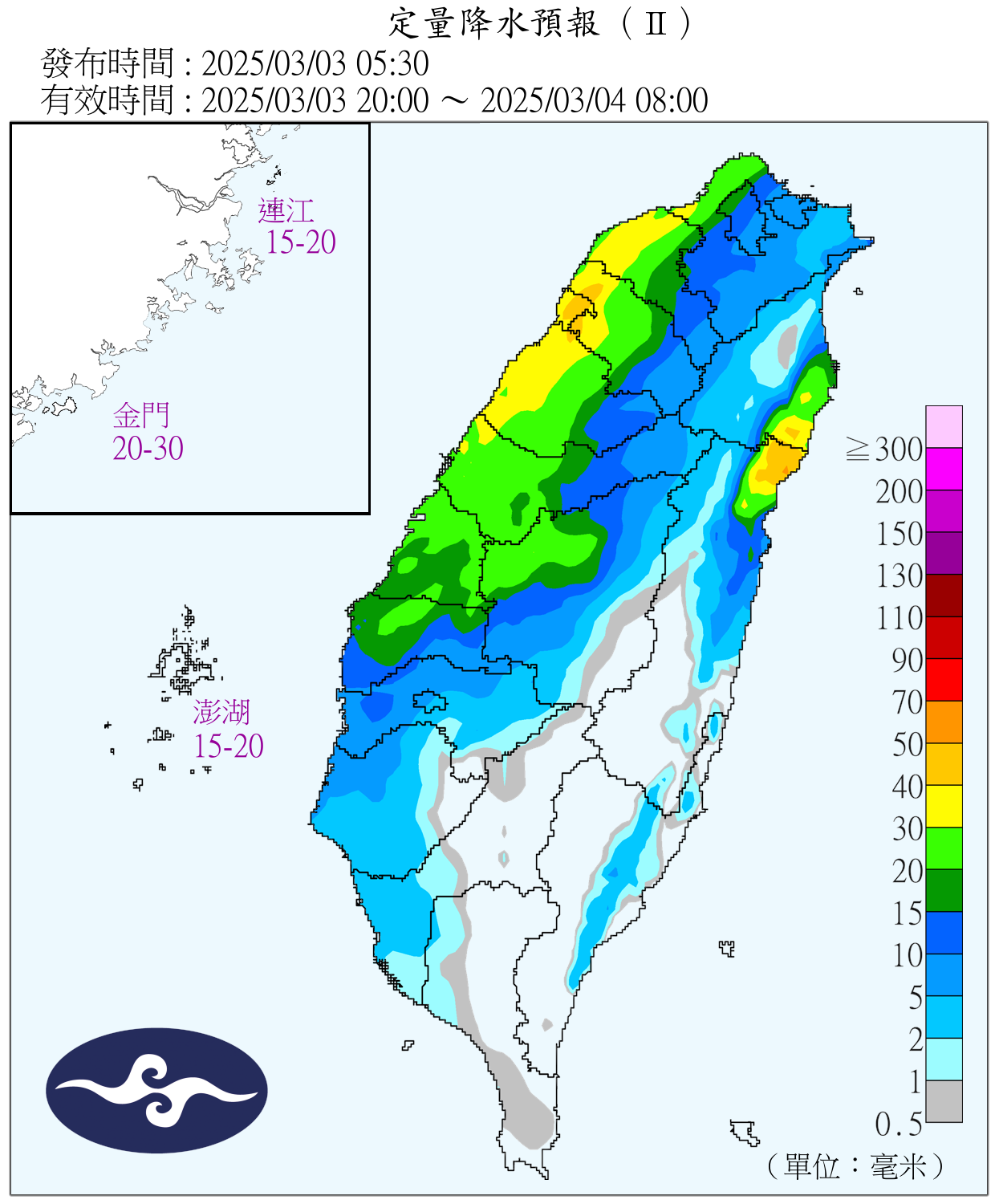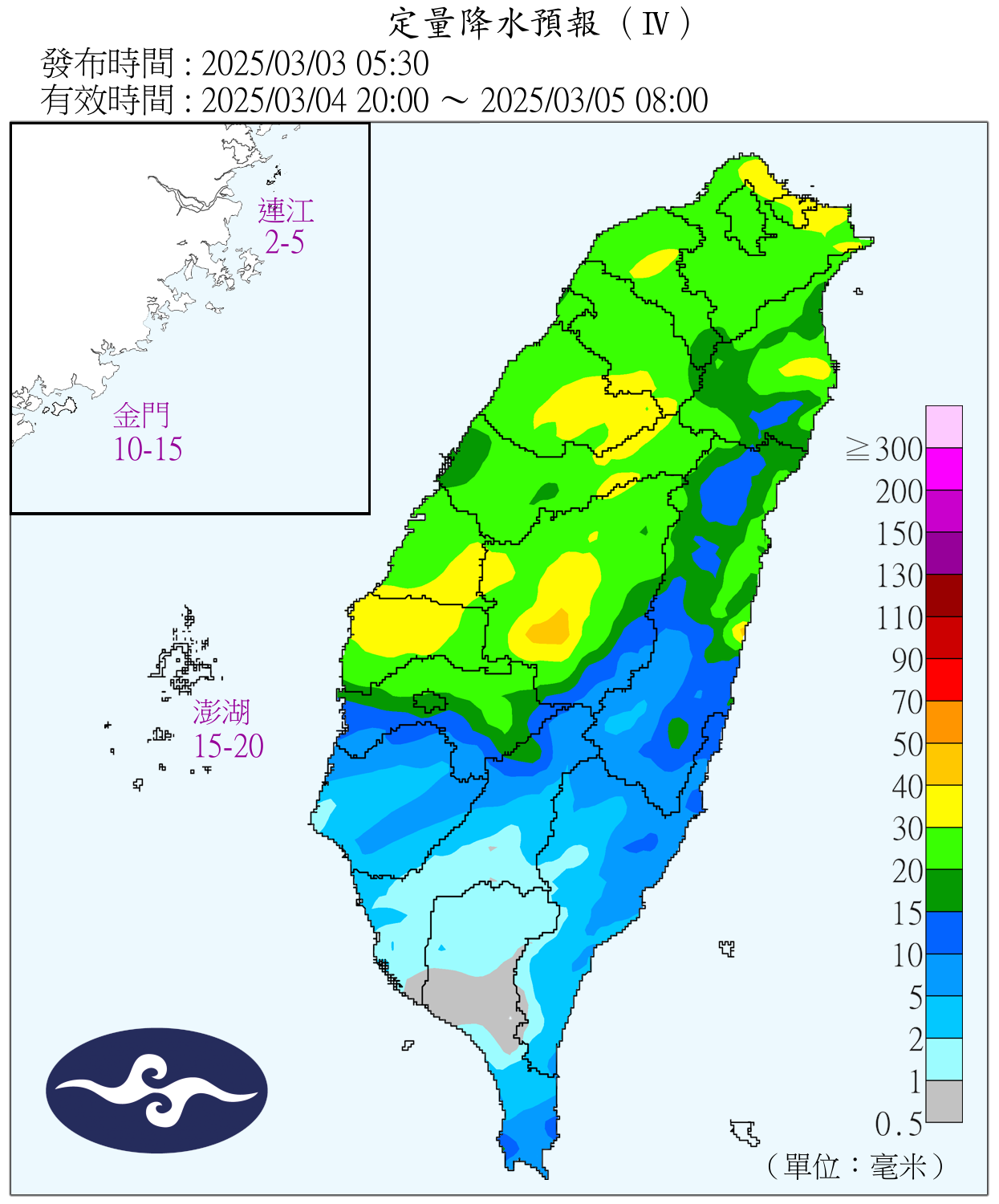 氣象署補充,週二的白天高溫雖仍有22到26度,但週三清晨起北部地區低溫將下探12度,各地也常見陣雨、雷雨,其中又以西部、宜花的局部大雨機率偏高。而週三到五之間,冷空氣持續與東移的華南雨區配合,中、北部、花蓮溫度剩下12度,白天高溫未達20度;南部、台東高溫雖有22度,但低溫也只剩16度。降雨部分則遍布全台,又以中部以北、宜花雨勢範圍較大且長。