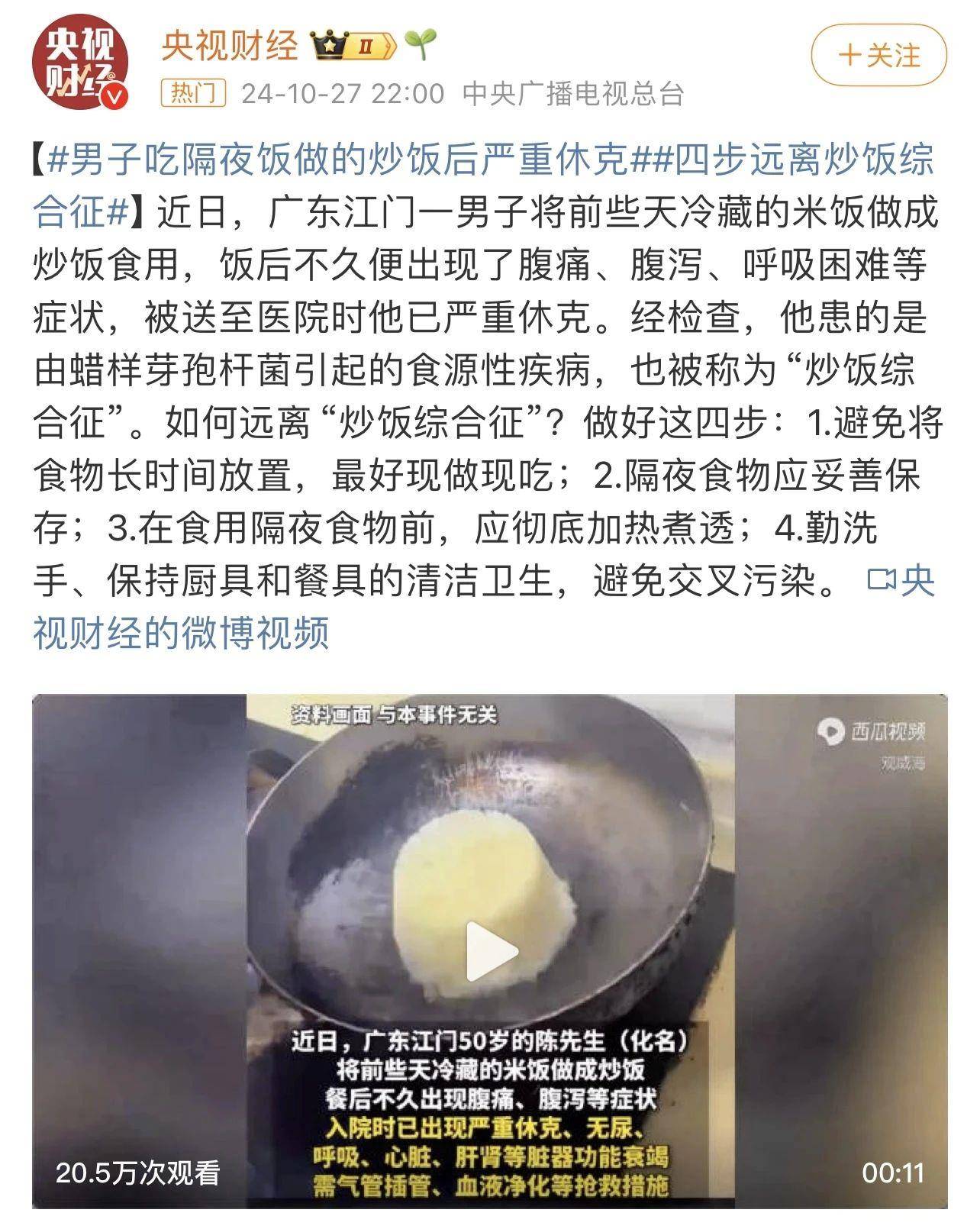 廣東江門,50歲的陳先生(化名)將冷藏了幾天的米飯做成炒飯食用後,不久便出現了腹痛、腹瀉、呼吸困難等症狀。
